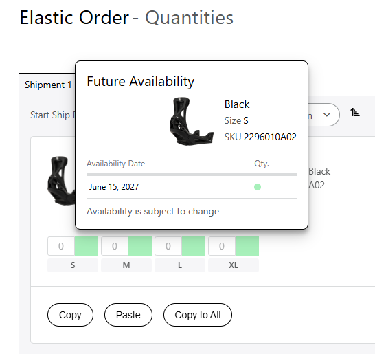 Quantity Entry is a feature that allows you to enter quantities immediately, in a separate window. It shows availability for the style and each colorway for that style. This window also includes your shipments organized by their shipping dates, so that you can plan shipments by availability. The 'Quantity Entry' window can be accessed in the 'Standard Order' entry method from the product listing page and the 'Enter Quantities' screen.