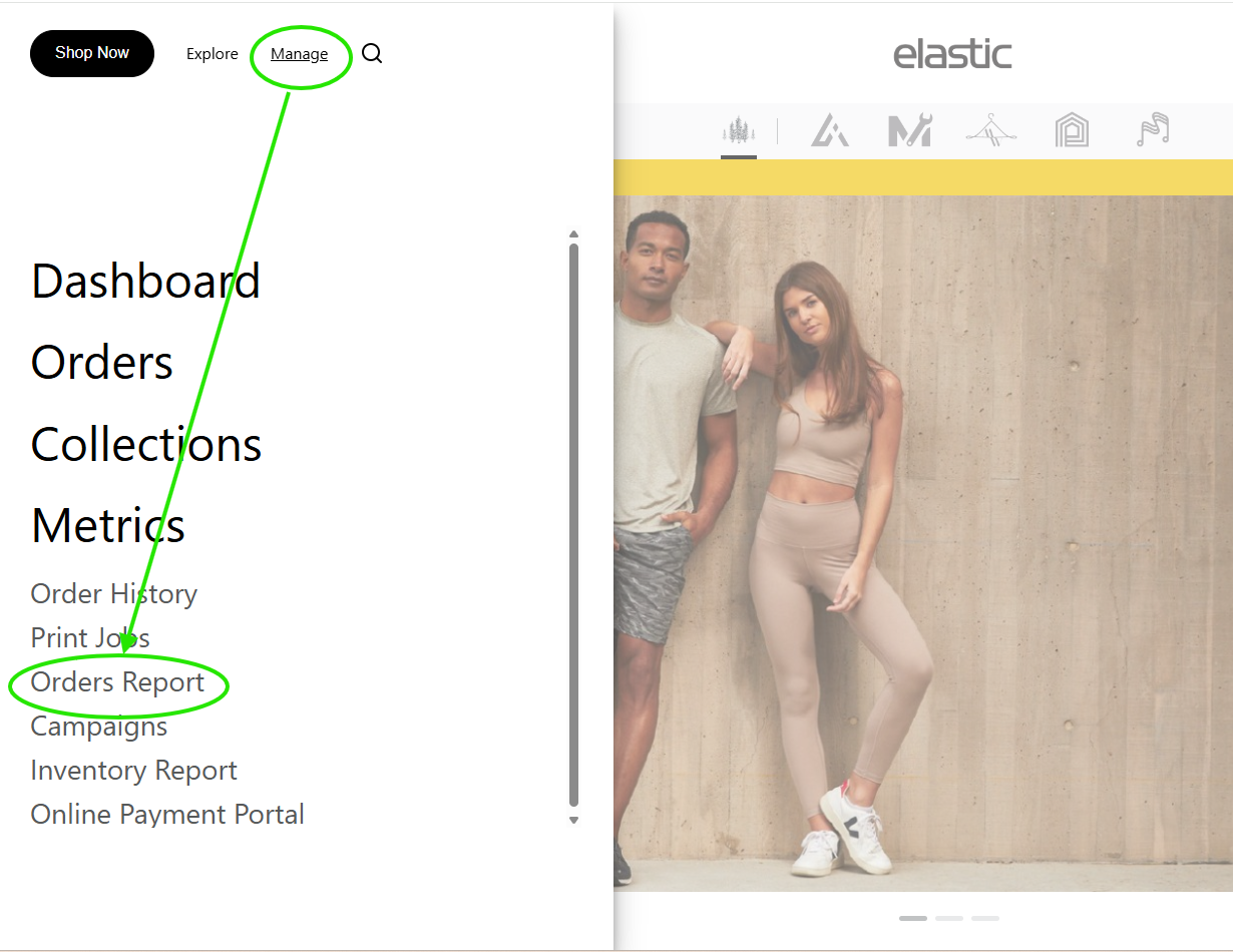 Access the Reports section from the 'Manage' menu option. If your Manage menu does not contain the 'Orders Report' option, reach out to your B2B Administrator to request it be added.