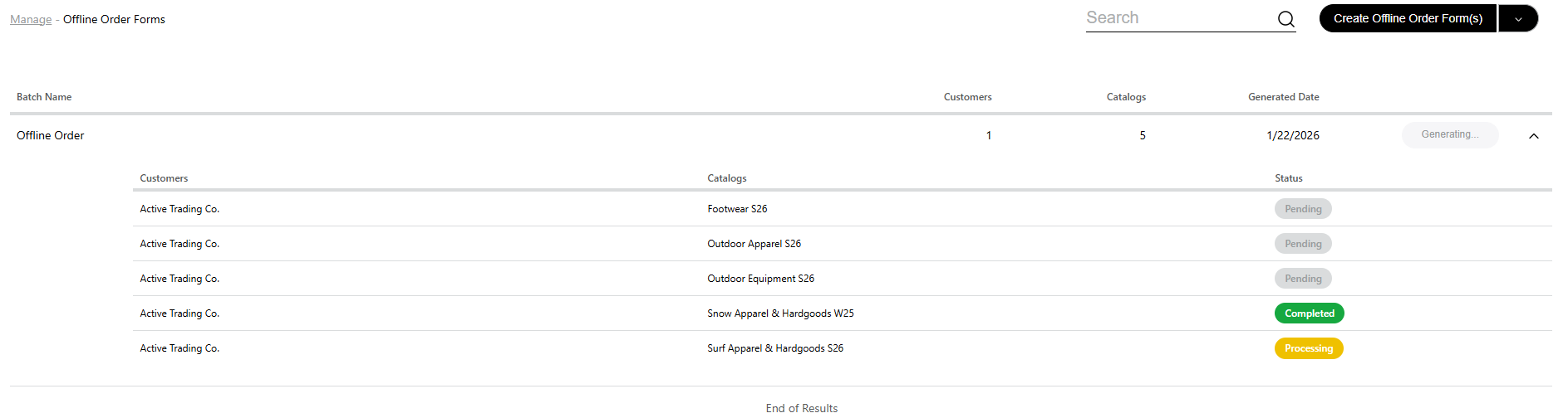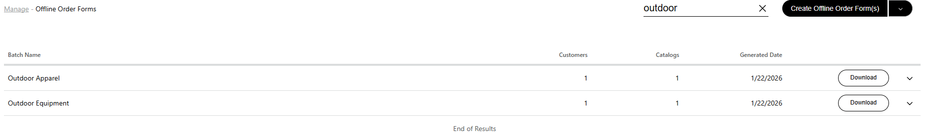 As a rep, you can now quickly find a previously created Offline Order Form by searching with a catalog name, Offline Order Form or the dealer name.